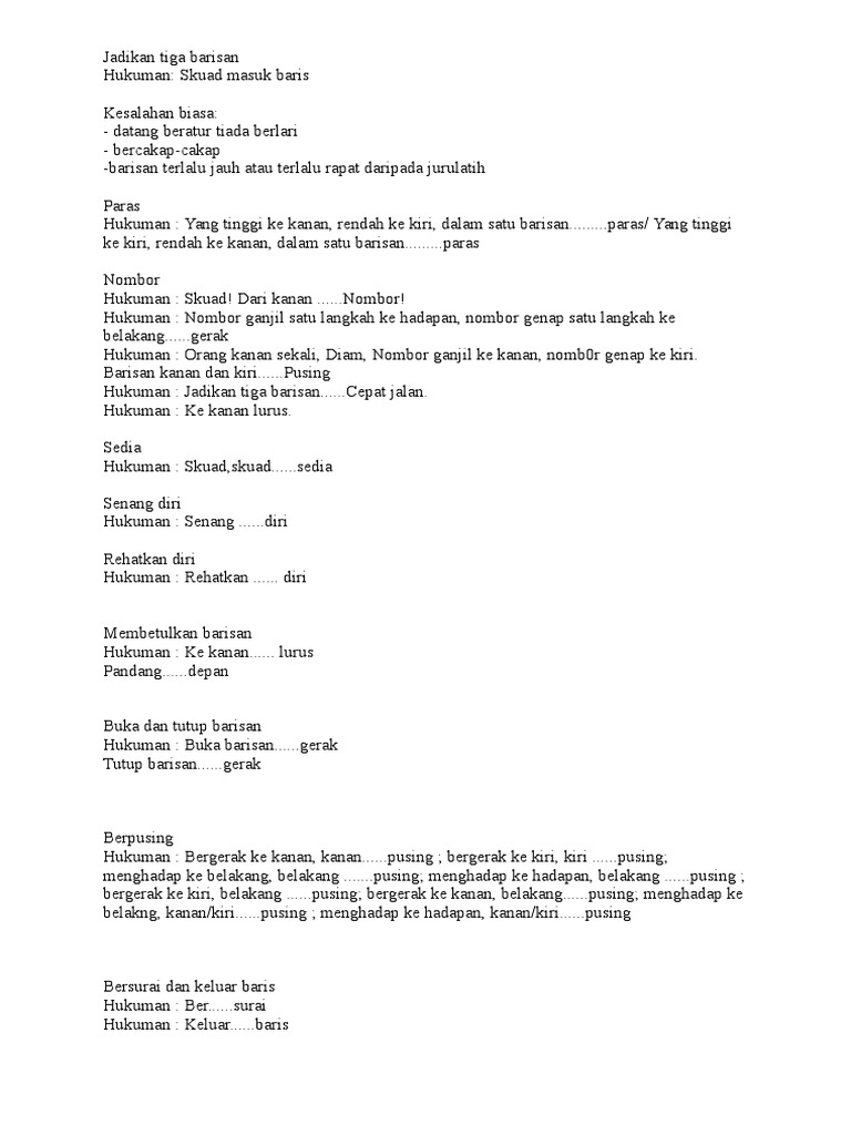 BAHASA HUKUMAN KAWAD DINAMIK BIL PERGERAKAN BAHASA HUKUMAN CATATAN 1 DOA MASUK BARIS Dengar sini semua sekali apabila mendapat hukuman tiga barisan di hadapan saya gerak skuad hendaklah sedia berlari berbaris di dalam tiga barisan di hadapan di tengah-tengah dimana saya mengadap. Check Pages 1-50 of BUKU-PANDUAN-KAWAD-KRS in the flip PDF version. Setiap kali dia memberi arahan kawad kami terasa ingin saja menutup telinga.